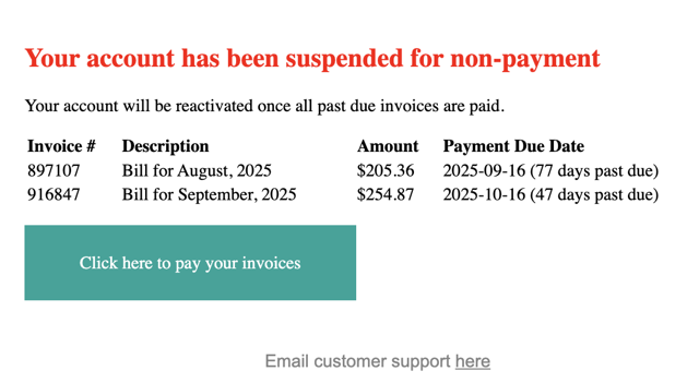 You may have received an email notification that your account has been suspended for non-payment that looks similar to this: