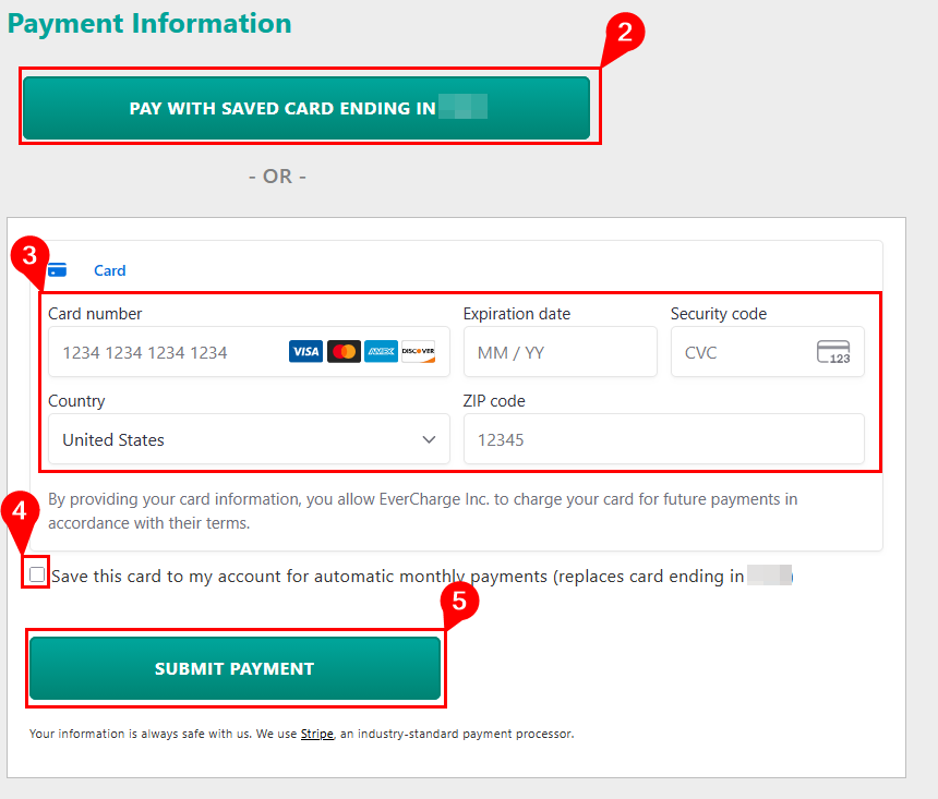 3.) If you do not have a valid payment method on file, you can enter your payment information in the area labeled #3.