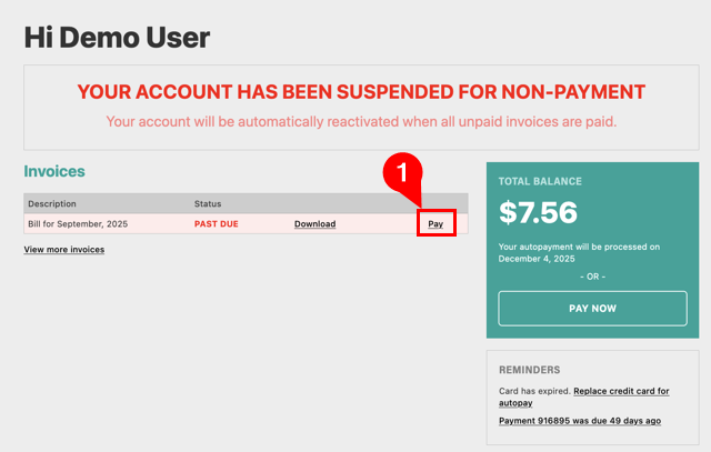 4.) Save your credit card information for recurring monthly invoices to avoid missing payments (optionally you can opt out of auto-payments and manage monthly payments, but your account may be suspended again if you do not log in and pay on time).
